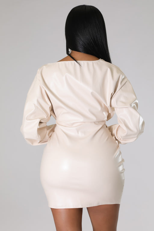 D-LUX$60.00| /Semi-stretch dress V neck Long sleeves Faux leather Ruched No closure 100% polyester Hand wash cold Reg. Model is wearing a Small MODEL ...